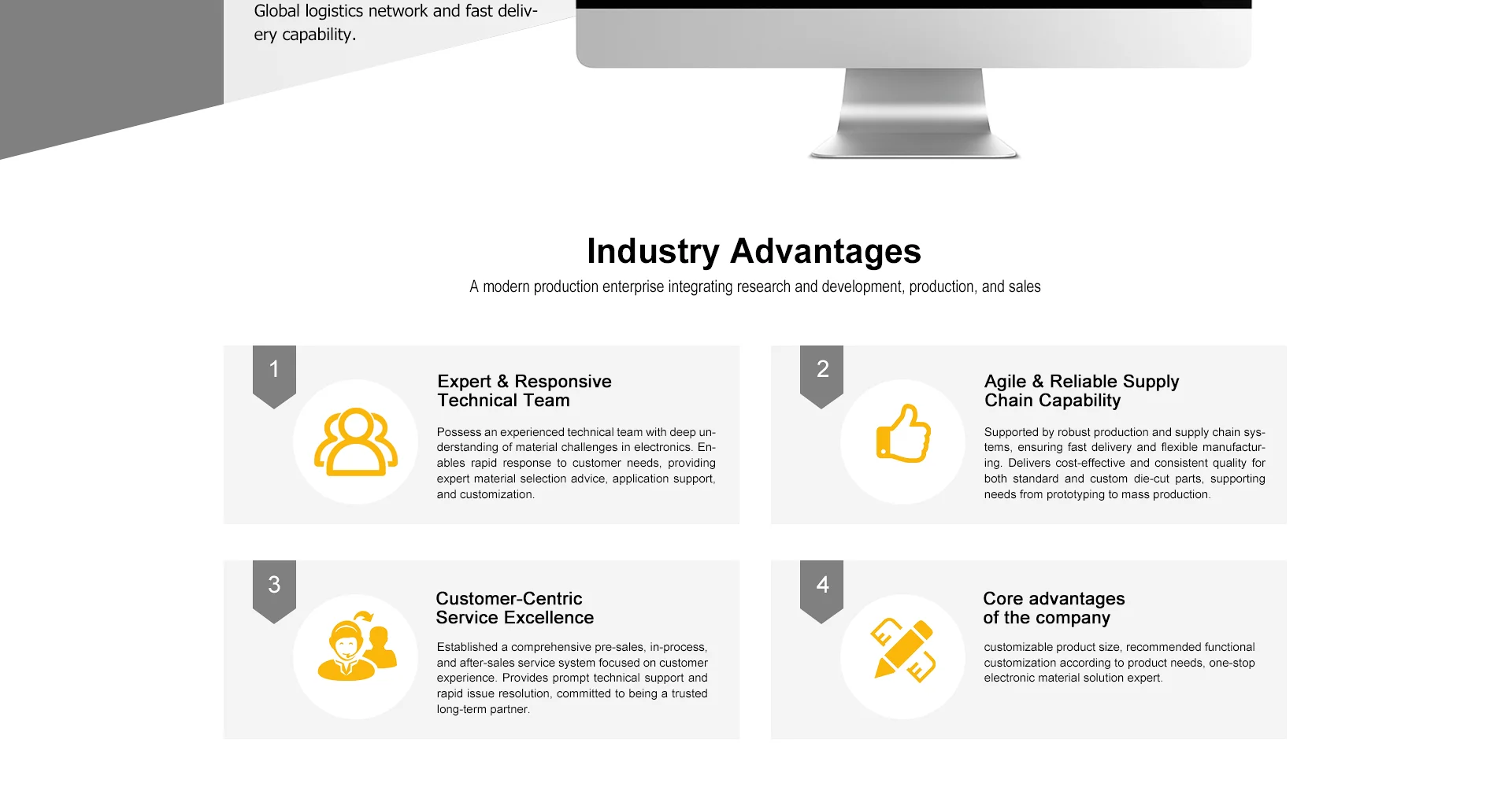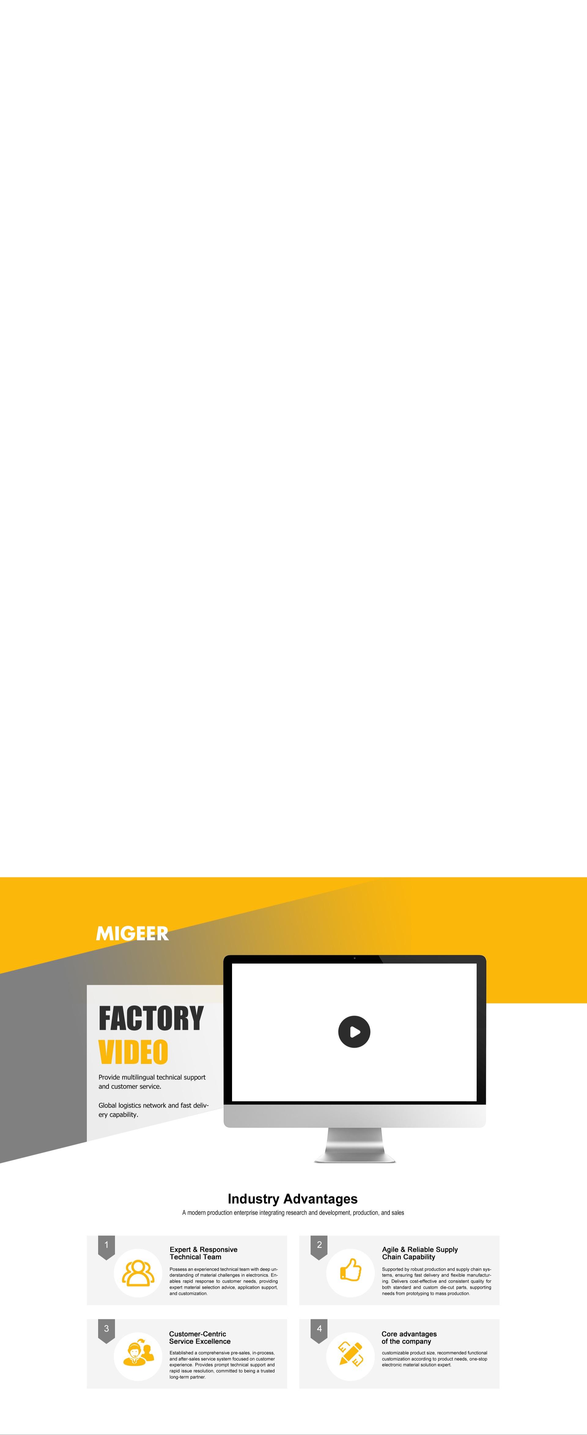 Core advantages of the company Customizable product sizes, functional customization based on product requirements, and a one-stop electronic materials solution expert.